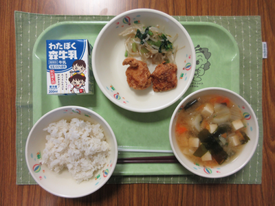 ごはん / 牛乳 / 鶏肉の唐揚げ / 小松菜の胡麻酢和え / 豆腐とわかめの味噌汁