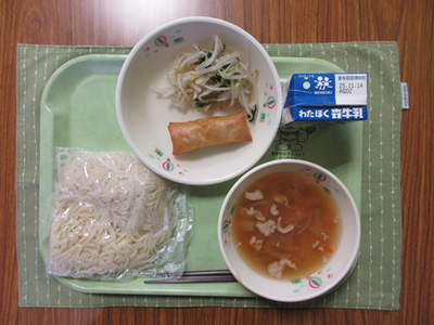 豆腐ラーメン / 牛乳 / 春巻き / 小松菜ともやしのソテー