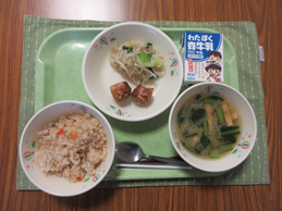 焼肉チャーハン/牛乳/揚げしゅうまい/チンゲンサイのソテー/小松菜の味噌汁
